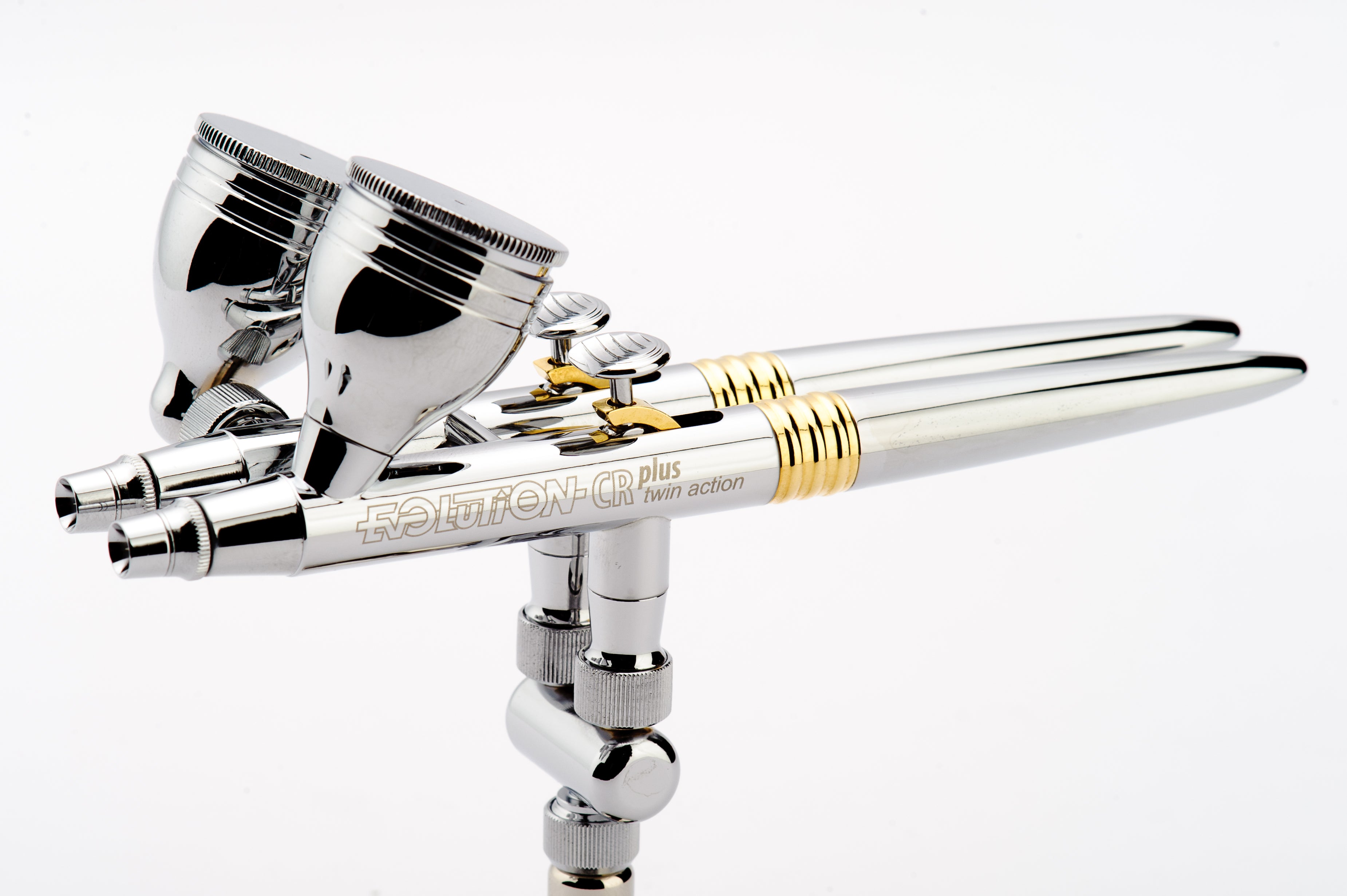 Die einzigartige Evolution CRplus Twin Action wurde in Zusammenarbeit mit dem bekannten Visagisten Enrico Lein entworfen. Diese Airbrush bietet viele praktische Vorteile, die besonders für schnell arbeitende Bodypainter und T-Shirt-Künstler nützlich sind.