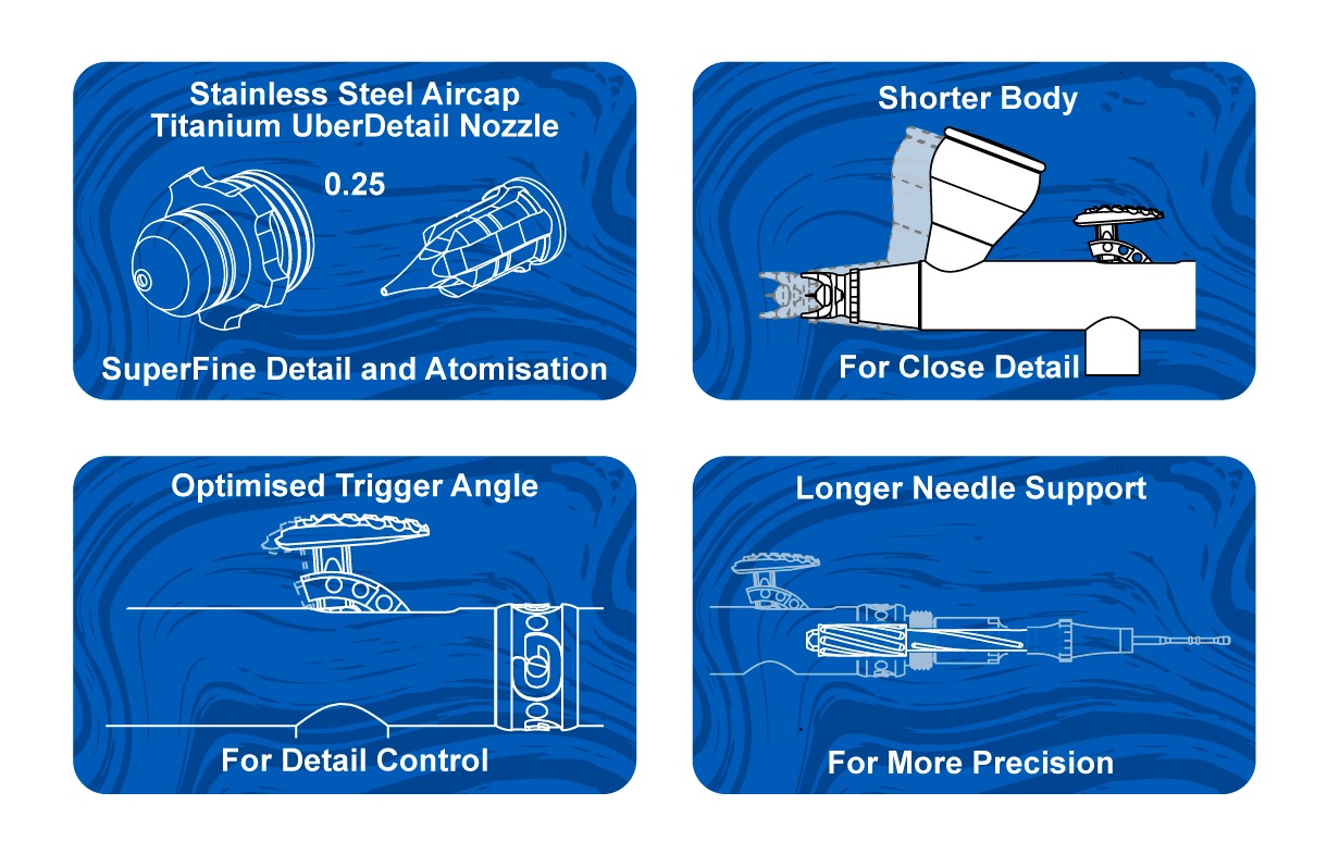 Mit dem 0,25-mm Edelstahl SuperFine-Kopfsystem der nächsten Generation und dem Titanium UberDetail-Düsensystem bietet die Giraldez MkII schärfere Details, überlegene Zerstäubung, außergewöhnliche Haltbarkeit und unvergleichliche Kontrolle über den gesamten Druckbereich – mit exzellenter Kontrolle und Atomisierung selbst bei extrem niedrigen Arbeitsdrücken.
