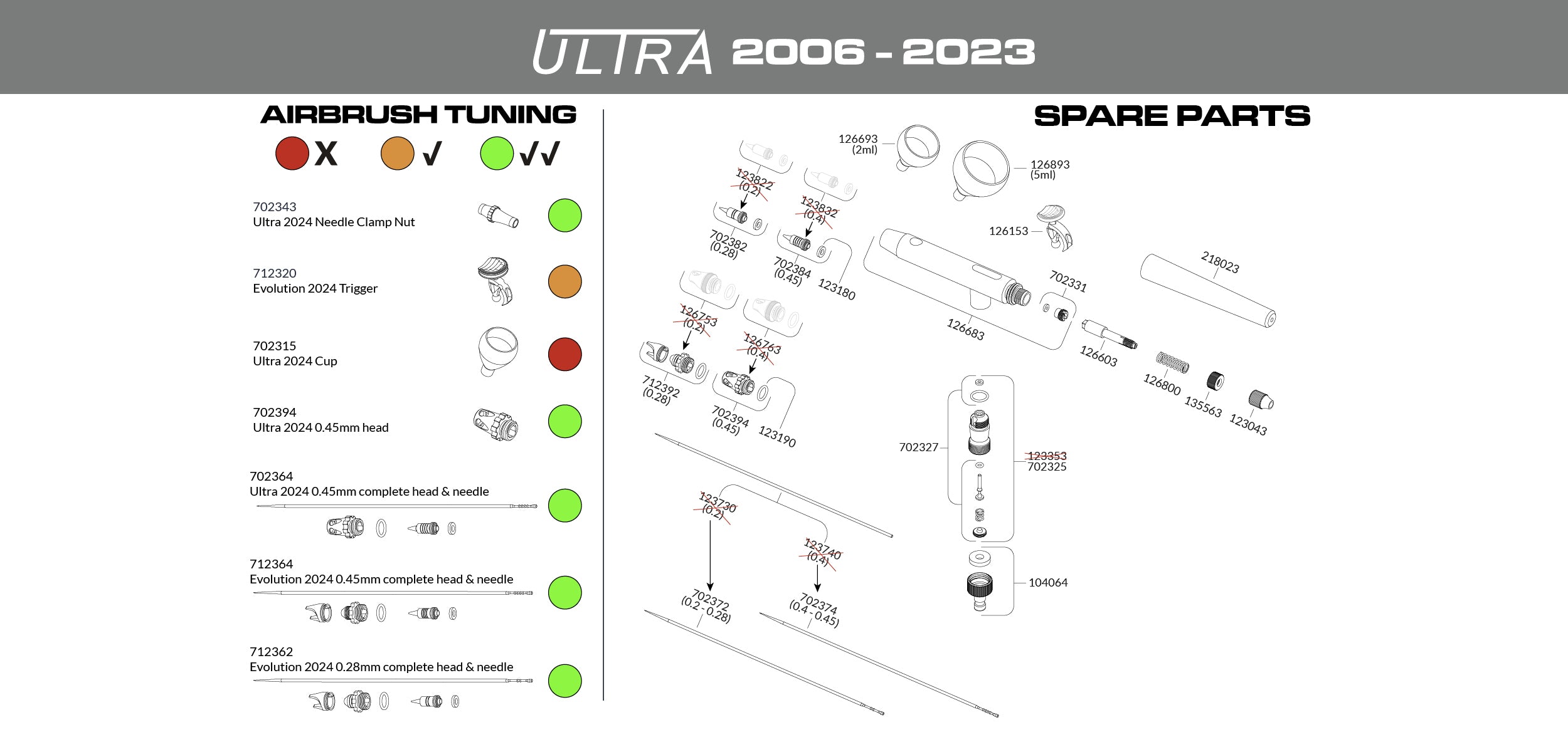 Juego de dirección ULTRA 2024 de 0,45 mm con boquilla, aguja, tapa de aire y juntas.