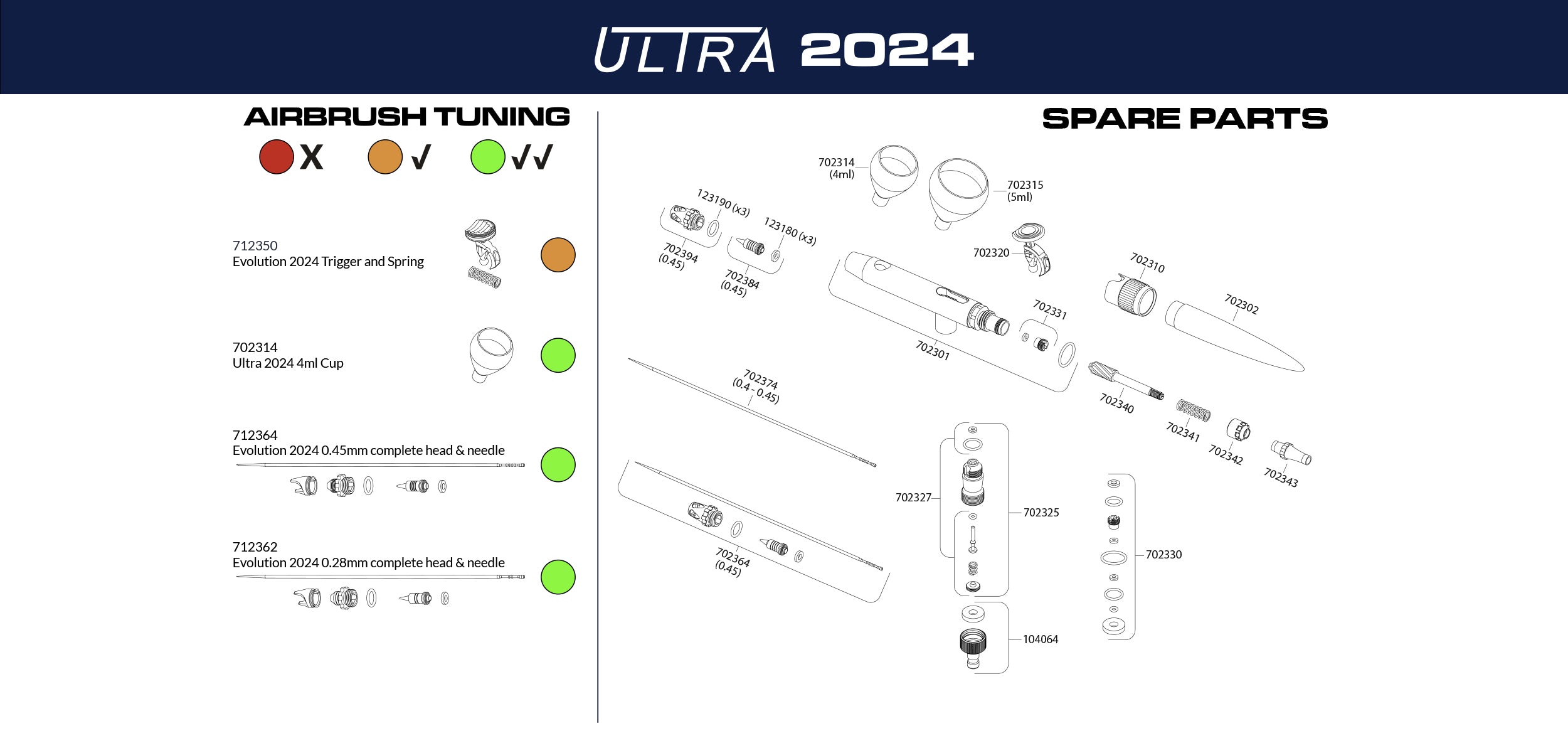 702364 - Juego de dirección ULTRA 2024 de 0,45 mm con boquilla, aguja, tapa de aire y juntas
